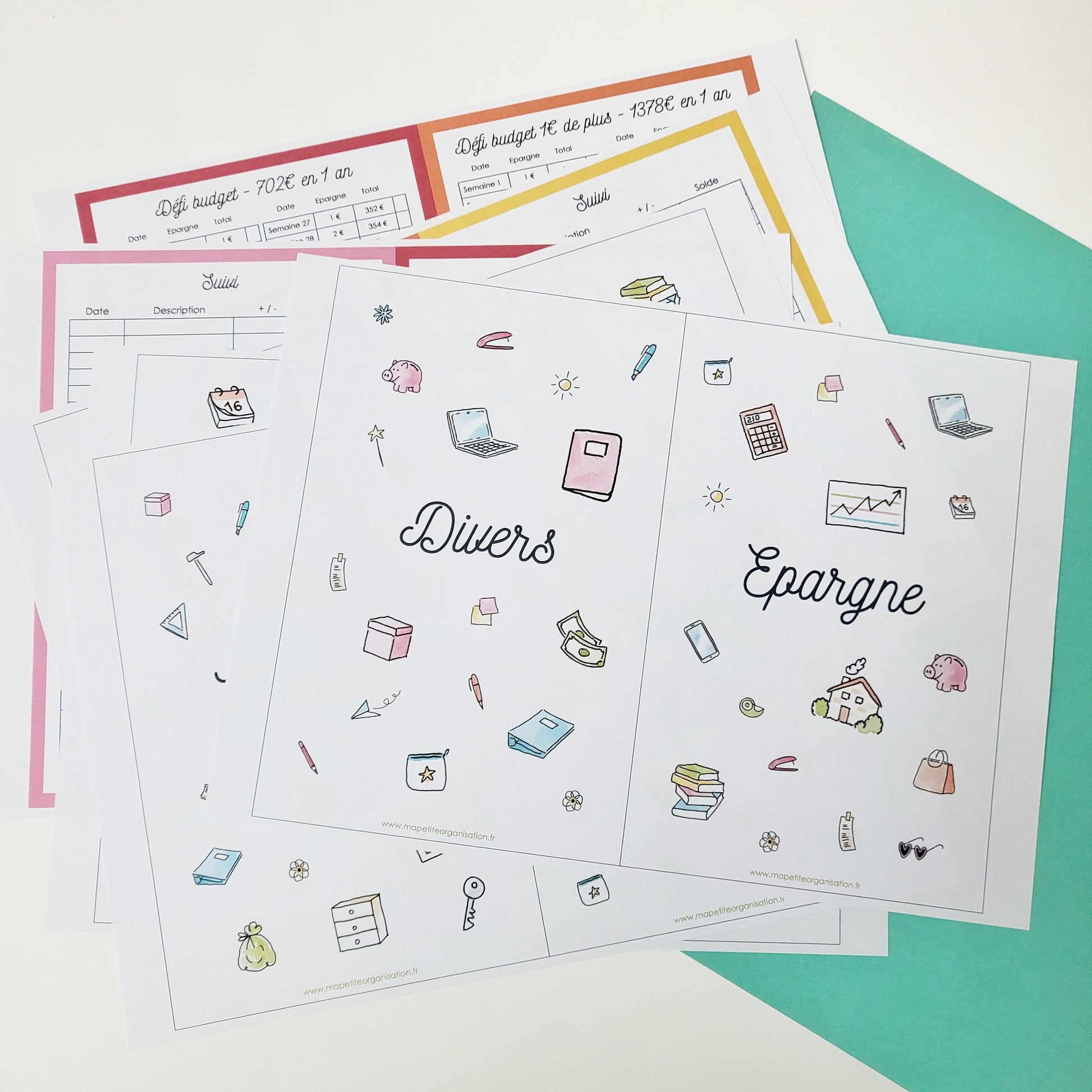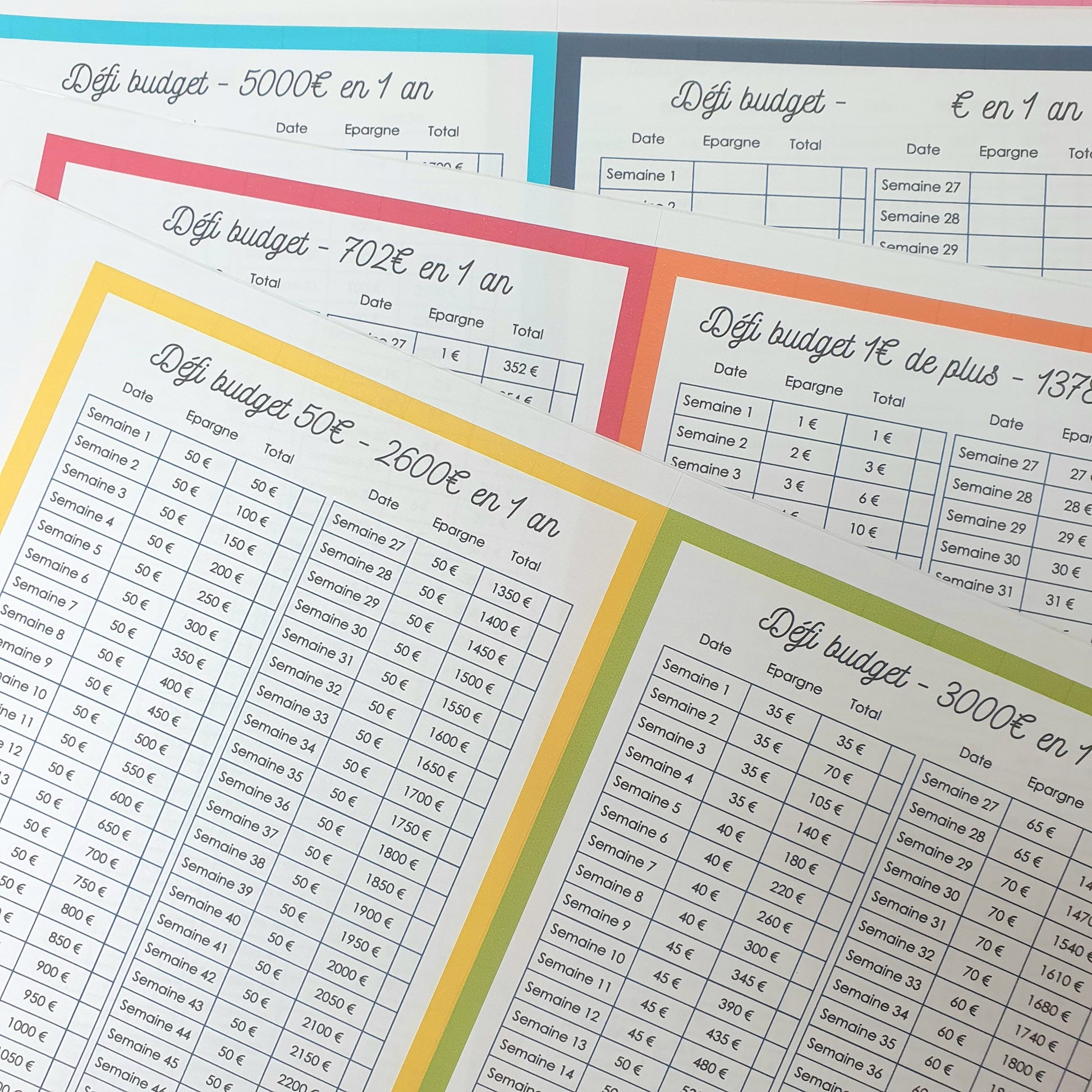- 7 pages de défi budget annuel (600€, 702€, 1378€, 2600€, 3000€, 5000€ et une page vierge pour y mettre ton propre défi).