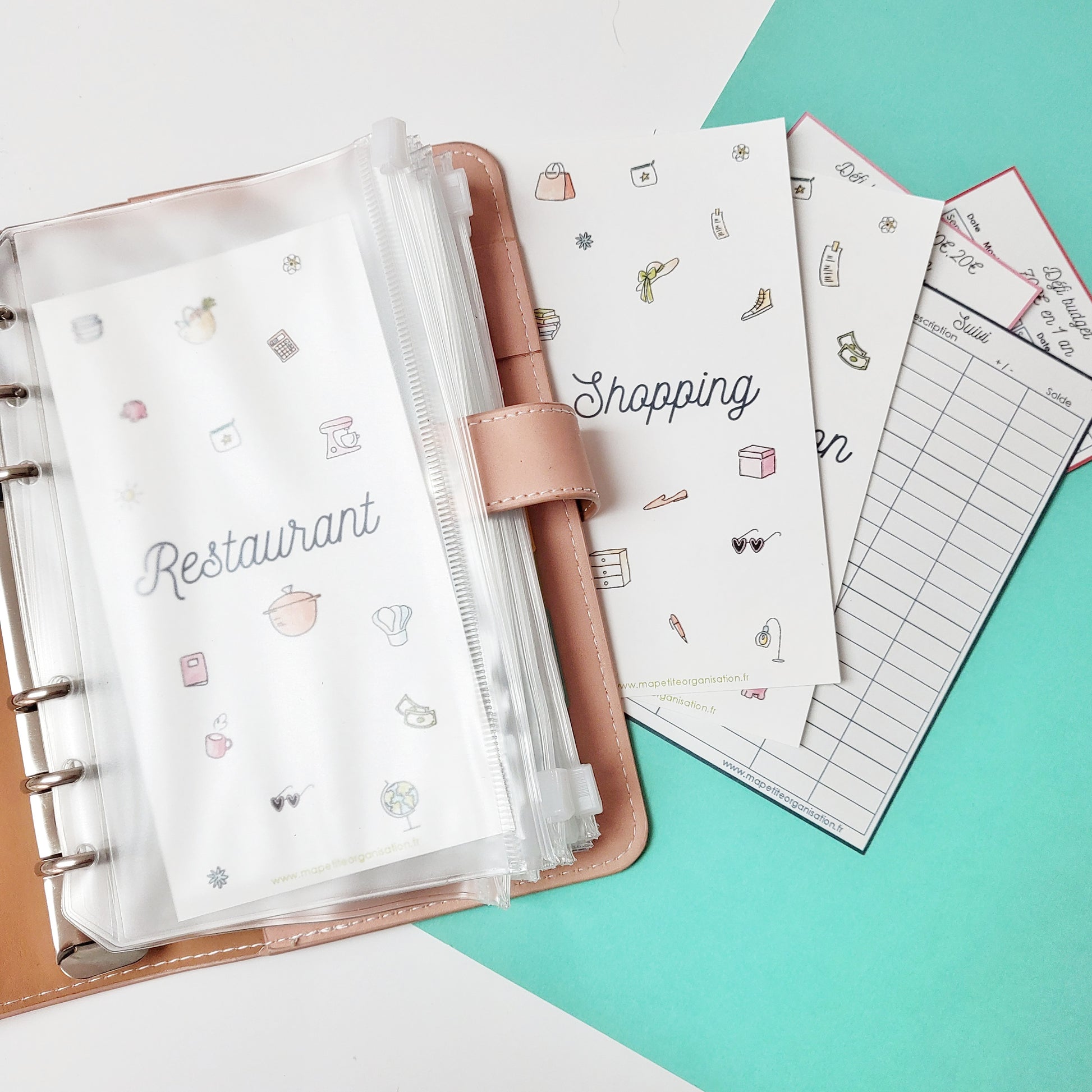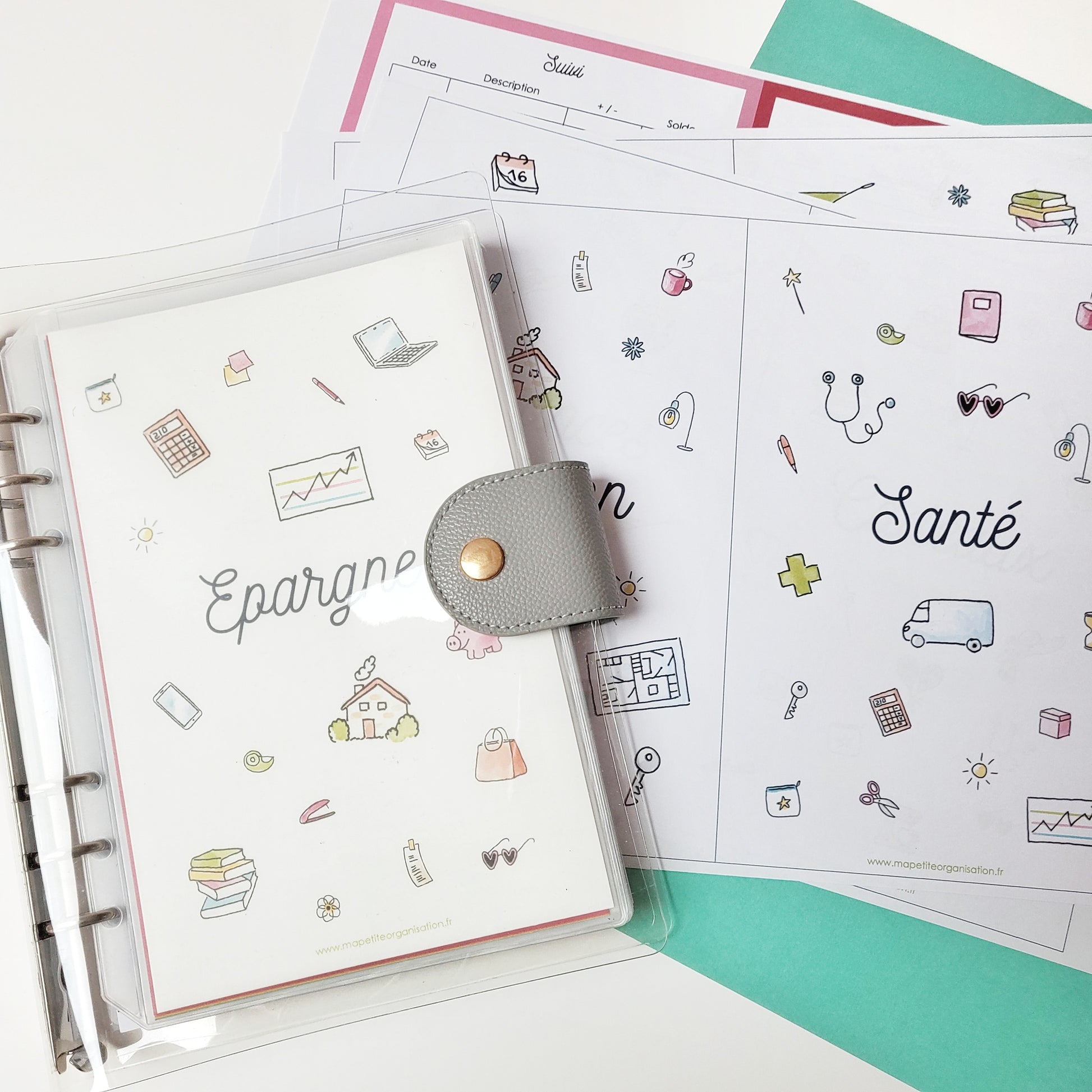 - 12 couvertures pour enveloppes budgétaires A5 (restaurant, shopping, alimentation, loisirs, vacances, cadeaux, beauté, transports, maison, santé, divers et épargne). Les illustrations ont été réalisées par Eve Grosset.